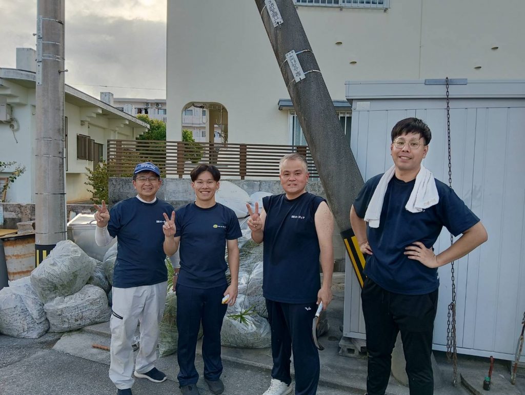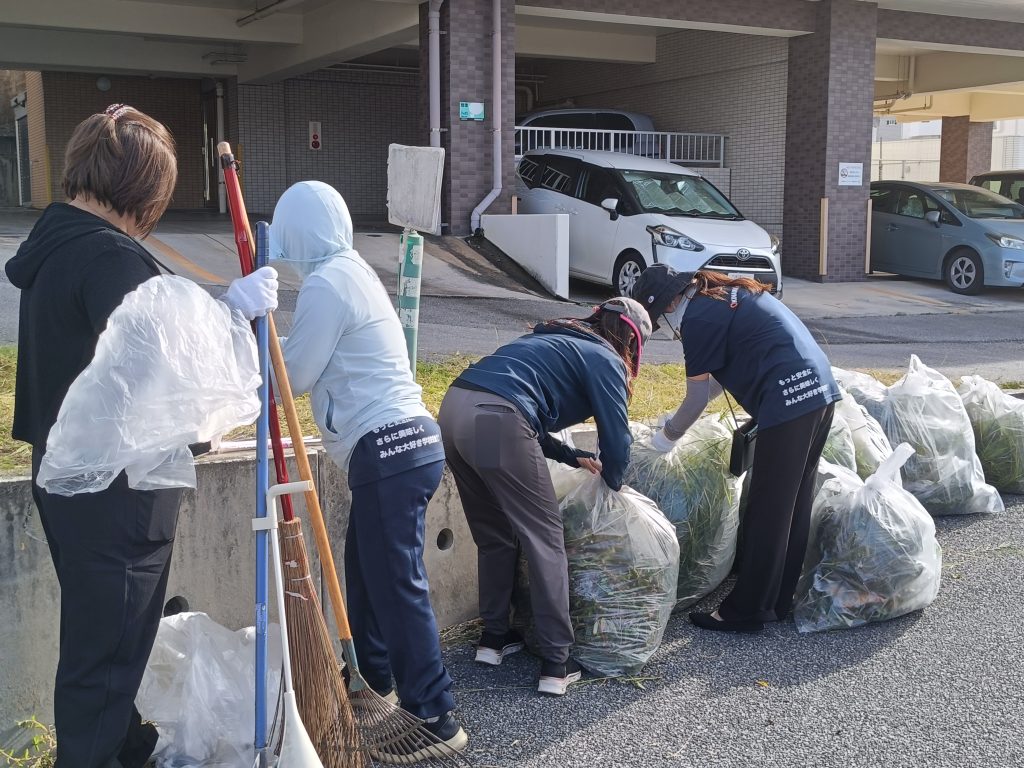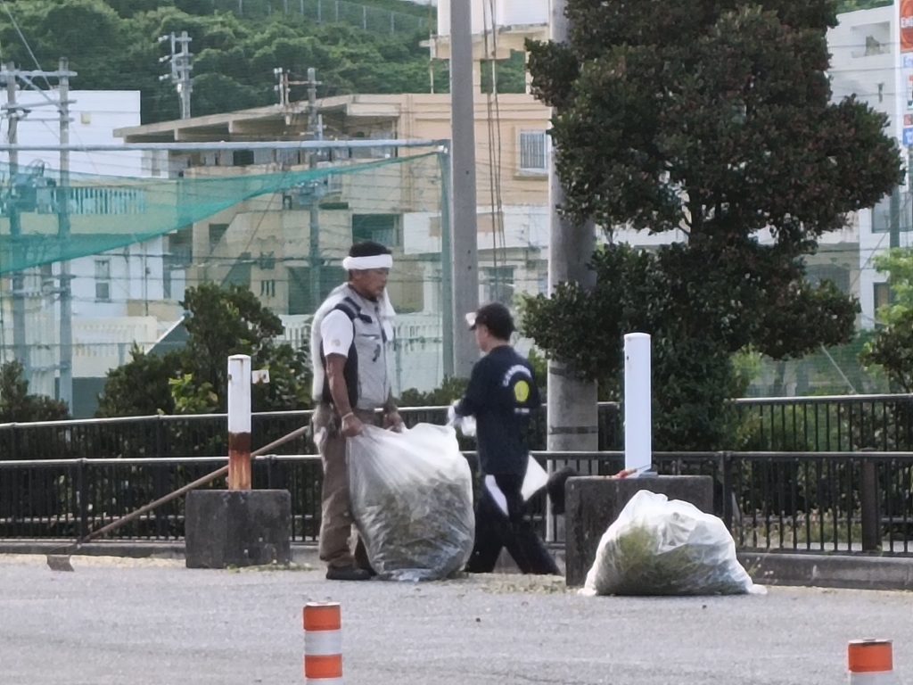 また、午後3時からは午前中に清掃できなかった場所を対象に、與那嶺常務をはじめ品質管理部、営業企画、本社調理場などのメンバーが、給食調理業務を終えた後に草刈りなどの作業を実施しました。日差しの強い時間帯ではありましたが、参加者は心地よい汗をかきながら、すがすがしい気持ちで多くの草を刈り取ることができました。