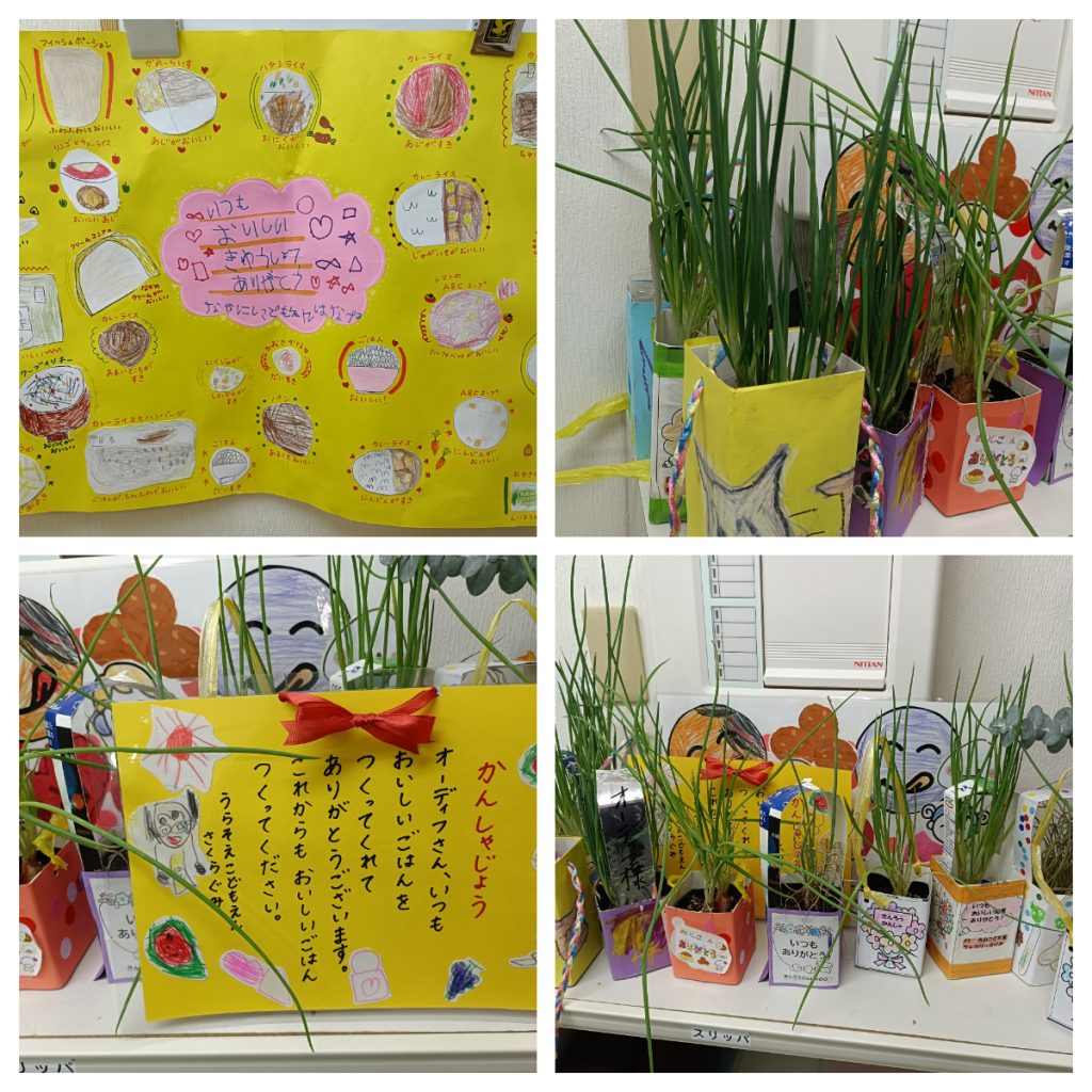 感謝状をはじめ、かわいらしい絵や、牛乳パックで育てた“ねぎらい”の「ネギ」にメッセージを書き添えてくださるなど、子どもたちの優しさが詰まった作品ばかりで、スタッフ一同たいへん感激いたしました。